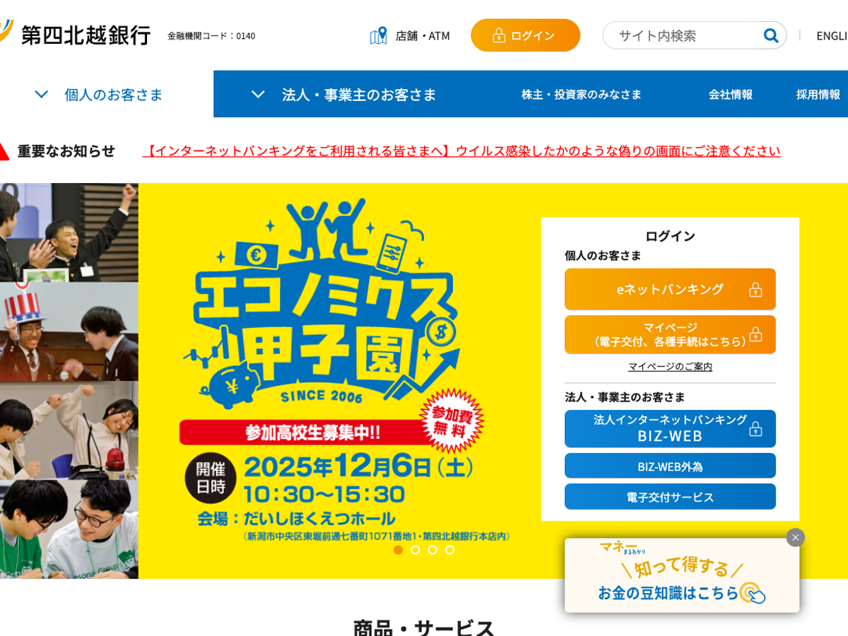 認定あり 新潟県 その他 株式会社 第四北越銀行 第四北越銀行は1873年創立の新潟県中心の銀行です。フレックスタイム制や育児・介護支援制度が充実し、子育て中も柔軟に働けます。多彩な休暇制度とゴールド認定が、ママに優しい職場を実現しています。 ★ くるみん ★ 新潟県多様で柔軟な働き方・女性活躍実践企業認定制度(Ni-ful)ゴールド認定 フレックス 時短勤務 気になるリストに追加 詳細を見る