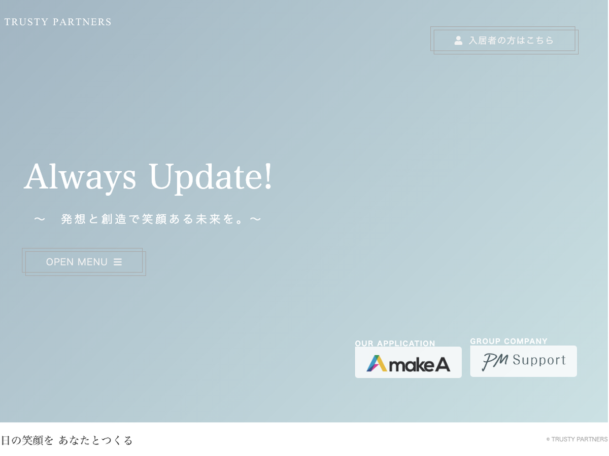 認定あり 東京都 その他 トラスティーパートナーズ株式会社 トラスティーパートナーズ株式会社は渋谷区の不動産会社で、資産運用サポートに注力。育児支援制度などの掲載はなく、詳細は不明ですが、安定した経営基盤を持つ企業です。 ★ くるみん 気になるリストに追加 詳細を見る